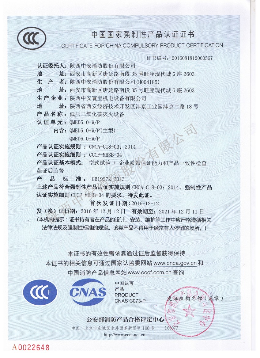2016年12月13日,陜西中安消防集團(tuán)山西名牌產(chǎn)品的低壓二氧化碳滅火設(shè)備取得3C證書,具體情況如下: